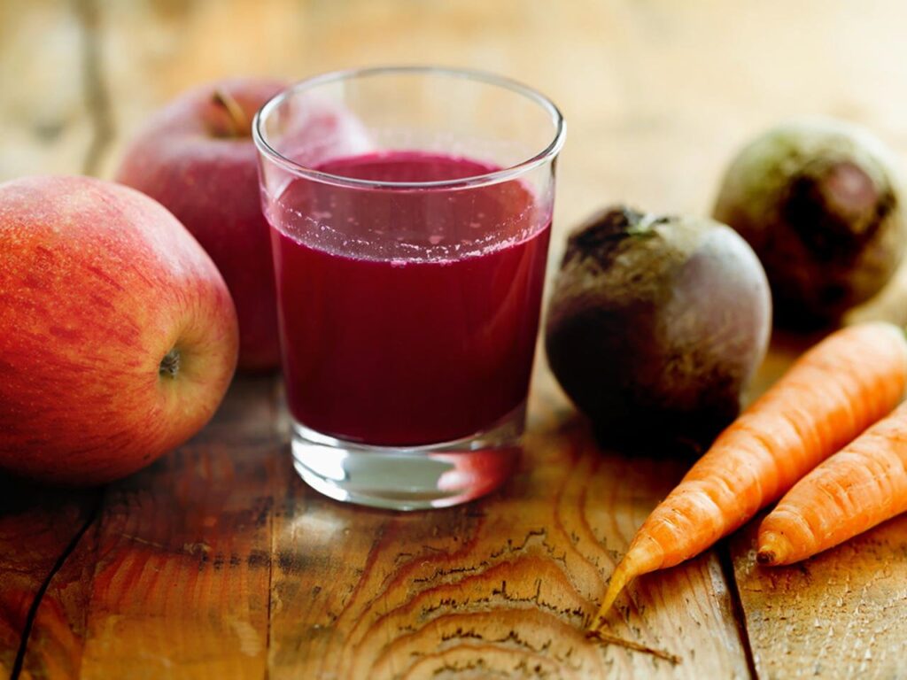 1 beterraba cortada grosseiramente, 1 maçã, 1 cenoura e água. Agora é só bater bem e mandar para dentro!